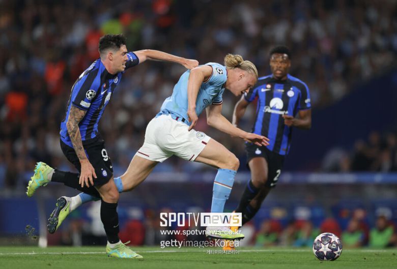 이번 시즌 유럽 축구계를 휩쓸고 있는 케빈 더브라위너와 엘링 홀란드 콤비도 계속해서 인테르밀란을 위협했다. 전반 26분 더브라위너가 뿌린 스루패스가 페널티박스 안으로 침투하는 홀란드에게 투입됐다. 홀란드는 몸싸움으로 상대 수비를 밀어낸 뒤 순식간에 일대일 기회를 만들었다. 이번 시즌 UEFA 챔피언스리그에서 가장 많은 선방을 기록하고 있는 안드레 오나나 골키퍼가 홀란드의 슈팅을 막아 냈다.