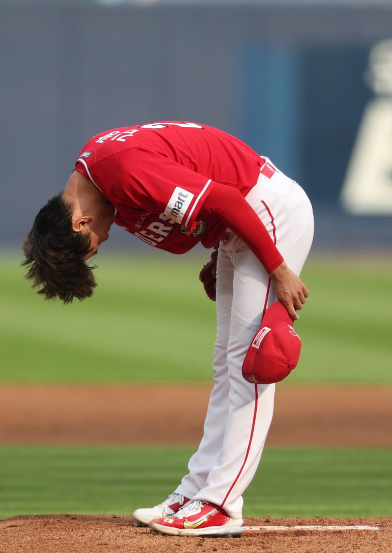 이날 김광현은 1회말 마운드에 올라 3루와 홈, 1루 방향으로 고개를 숙여 사과 인사를 전한 뒤 투구를 시작했다. 최정의 홈런으로 1-0 리드를 안고 등판한 김광현은 서호철과 김성욱을 2루수 땅볼 처리, 박건우는 좌익수 직선타로 깔끔하게 1회를 끝냈다.