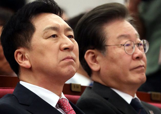 김기현 국민의힘 대표와 이재명 더불어민주당 대표가 22일 오전 서울 여의도 국회도서관에서 열린 ‘민주화추진협의회 결성 39주년 기념식’에 자리하고 있다. 2023.5.22/뉴스1 ⓒ News1 |