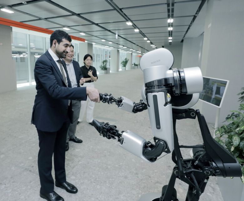 셰이크 사우드 술탄 빈 모하메드 알 카시마 아랍에미리트 공화국 샤르자에미리트 왕실 왕자가 12일 경기도 성남시 네이버 1784 사옥을 찾아 로봇과 인사를 나누고 있다. 네이버 제공