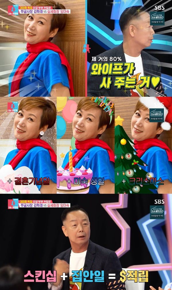 이날 서장훈은 “아내 덕 본 개그맨 TOP3가 3위가 이봉원, 2위가 최양락, 1위가 김학래다”며 “명품옷은 아내가 사주시는 거냐”고 물었다. 이에 김학래는 “거의 80%는 아내가 사주는 거다. 경제권을 가지고 있다. 스포츠카를 타고 싶으면 죽음으로(?) 어필한다”고 너스레 떨었다.