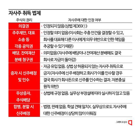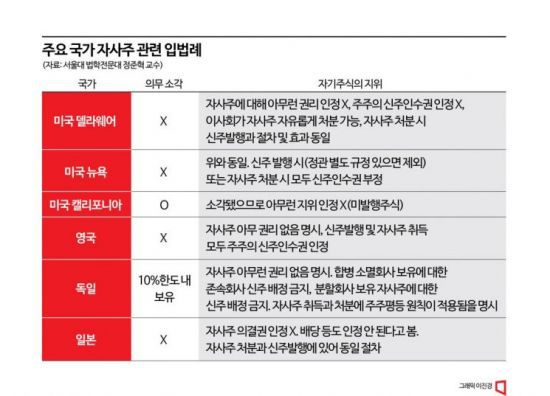 또 자사주 처분을 강화하는 방안도 논의되고 있다. 자사주 처분 절차를 강화해야 한다는 주장이다. 국내에서는 자사주 처분 때 별다른 절차나 통제가 없다. 이 때문에 ‘주주평등의 원칙’ 등이 적용되지 않는다는 비판이 제기돼왔다.