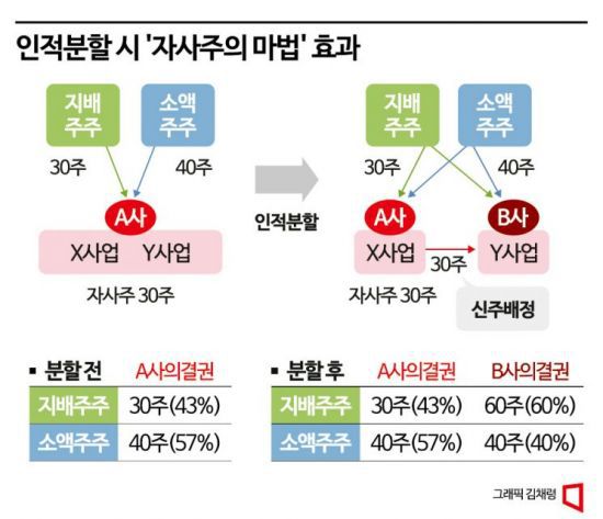 예컨대 OCI, 한화솔루션, 동국제강 등은 지주사 전환 때 인적분할로 자사주를 대주주 지분율 확대에 이용했다. 인적분할은 물적분할 때와 달리 지분율대로 신설법인 주식이 생긴다. 이때 의결권이 없는 자사주도 의결권을 가진 주식으로 바뀐다. 이를 ‘자사주의 마법’이라고 부르다. 대주주 입장에서는 지주사 체제로 지배구조를 개편하고, 신설법인에 대한 지배력도 확대할 수 있는 요긴한 수단이다. 대주주가 돈을 내고 지분을 취득하는 대신 배당 가능 이익인 자사주를 이용해 지배력을 강화하는 것이다.