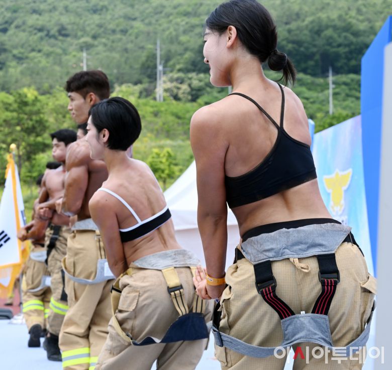 아시아투데이(세종) 박성일 기자 = 13일 오후 충남 공주시 중앙소방학교에서 열린 제36회 전국소방기술경연대회 몸짱소방관 선발대회에 참가한 유이한 여자 소방관들이 자신의 근육을 뽐내고 있다.
