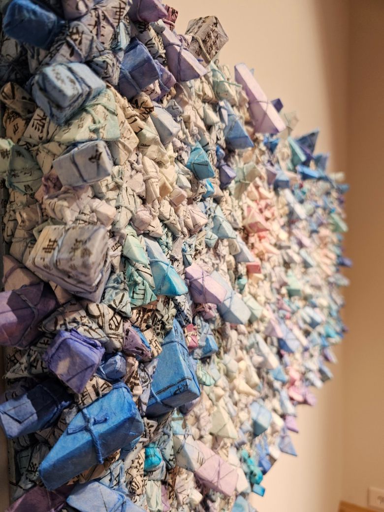 아시아의 보자기 문화에서 착안한 작가의 연작 시리즈는 어린 시절 큰아버지의 한약방 천장에 매달려 있던 무수히 많은 한약재 봉지를 바라보던 기억에서 비롯됐다고 한다. 약봉지를 연상시키는 형태의 삼각기둥을 한지로 감싼 후 매듭을 묶어 작은 조각을 만든 후 화면에 일정한 패턴으로 재배열해 그만의 독특한 입체 회화 ‘집합’ 시리즈를 창조해 낸 것. 70~80년에서 많게는 150년 전에 만들어진 책들을 해체해 낱장이 된 한지가 작가의 손끝에서 수천수만의 매듭으로 연결되어 현대미술 작품으로 재탄생 된다.