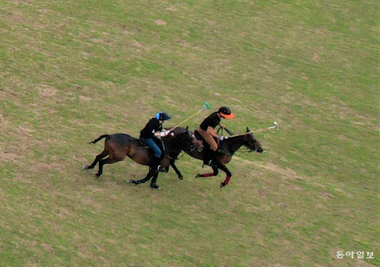 축구장 6배 크기의 잔디밭. 말을 탄 8명의 선수들이 공을 좇아 쏜살같이 달려 간다. 말 위에서 긴 스틱을 휘둘러 하얀색 공을 맞추자 ‘탕’하는 소리가 퍼져나간다. ‘우두두두~’ 육중한 말들이 지축을 박차는 소리가 심장을 쿵쿵 울린다. 이어지는 박수소리, 환호성소리. 서양의 왕족이나 귀족들이 즐기는 스포츠로 알려진 폴로 경기를 한국에서 즐기고 있다는 사실이 매우 낯설면서도 진기한 장면이다.