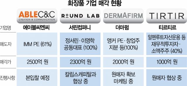 20대 남성 기초화장품으로 인지도를 쌓은 ‘독도토너’ 브랜드를 보유한 라운드랩의 운영사 서린컴퍼니는 신생 사모펀드(PEF) 운용사인 칼립스캐피탈과 지분 100%를 2300억 원에 매각하는 협상을 하고 있다. 이 밖에 ‘도자기 크림’으로 유명한 티르티르는 경영권에 해당하는 40%가량의 지분을 매각하며 SKS PE와 워터브릿지가 인수 8년 차를 맞은 비앤비코리아도 잠재 매물이다.