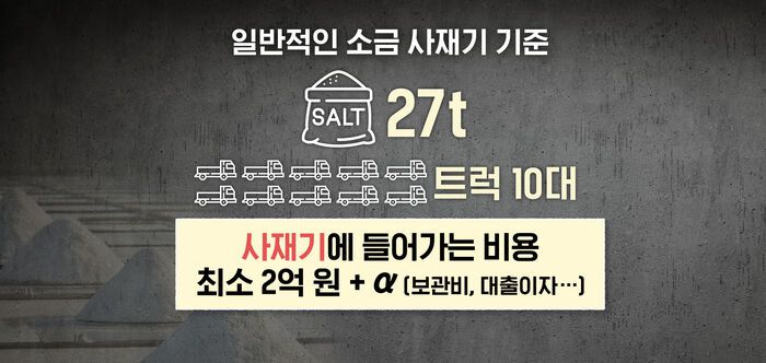 경제적으로도 그렇습니다. 일반적인 소금 사재기 관리 기준은 염전 2만㎡(6천 평) 1년 치 생산량인 27t을 한 번에 사들일 때로 보고 있습니다. 트럭 1대에 20kg 소금 1천350포를 싣는데, 이 정도면 트럭 10대에 싣는 양이라고 합니다.