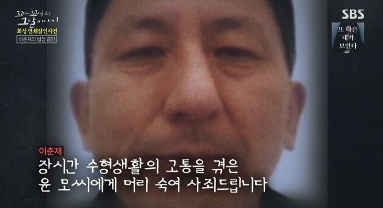 이춘재) 제가 저지른 살인사건에 의해서 억울한 누명을 쓰고 장시간 수형생활의 고통을 겪은 윤모 씨에게 머리 숙여 사죄드립니다. 저로 인해 죽은 피해자들의 명복을 빌며, 참회하는 마음으로 살도록 하겠습니다. 다시 한 번 머리 숙여 죄송하다는 말씀 드립니다. 죄송합니다.