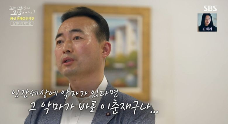 "범행을 하는 장면을 묘사할 거 아니에요. 어떻게 피해자를 조우했고 어떻게 제압해서 어디로 끌고 가서 어떻게 범행을 하고. 이런 것들을 이제 영화에나 나올법한 얘기들을 덤덤하게 하는 거죠. 남 얘기하듯이. '인간세상에 악마가 있다면, 이춘재가 악마구나' 그런 생각을 하게 됐죠."