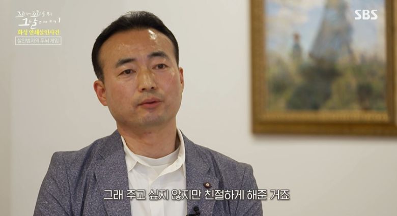 "처음에 접견을 시작했을 때는 프로파일러들을 바깥 의자에 대기를 시키고 있었거든요. 왜냐하면 프로파일러들이 다 여자예요. (이춘재가) 어떻게 나올지 모르니까. 돌발적으로 사고가 날 수도 있고. 이춘재가 들어올 때 프로파일러들을 봤거든요. 이춘재가 급 호기심을 보였죠."
