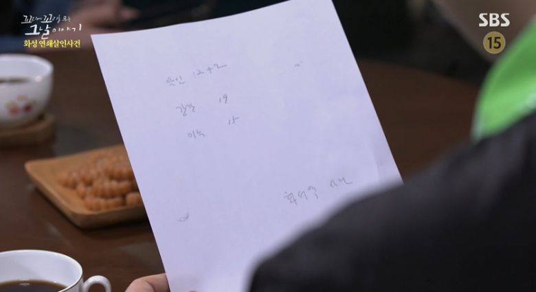 '살인 12+2, 강간 19, 미수 15' 구체적인 범행 숫자가 적혀있어. '살인 12+2'를 본 프로파일러는 "화성에서 2건, 다른 지역에서 2건의 살인이 더 있는 건가요?"라고 물었어. 그러자 이춘재는 "12건은 화성에서 한 거고, 2건은 청주입니다"라고 대답했어.