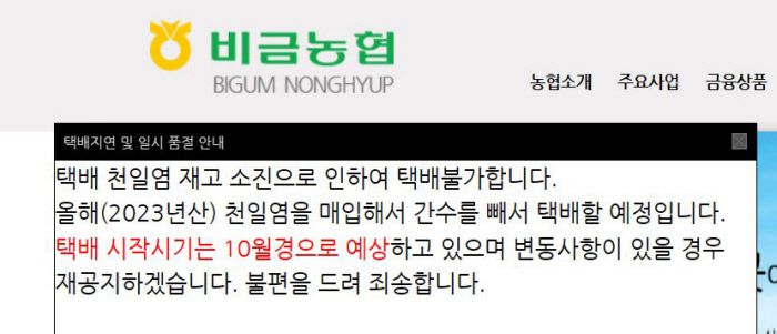 전남 신안군 비금농협도 15일 홈페이지 공지를 통해 ‘천일염 품절’을 알렸다. 비금농협은 택배 판매 재개 시점을 오는 10월쯤으로 안내했다.