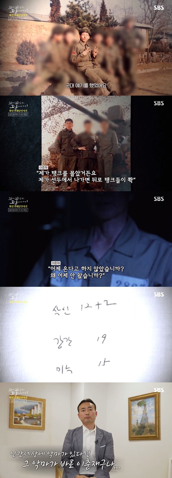 이성준 형사는 "이미 머릿속에 사건들을 정리한 거다. 살인 사건뿐만 아니라 강간 사건까지 사건 건수, 범행했던 지역들을 정확하게 정리해왔다. 화성 사건의 경우에는 논의 이삭 색이 어땠는지 떠올렸고 직접 사건 현장을 그리기도 했다. 남 이야기하듯이 덤덤하게 말했다. '인간 세상에 악마가 있다면 이춘재가 악마구나'라는 생각을 하게 됐다"고 털어놨다.