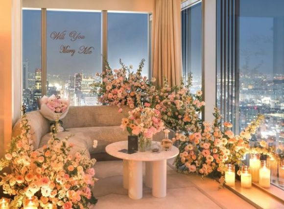 조선팰리스 서울 강남이 플라워&라이프스타일샵 ‘격물공부’와 협업해 출시한 프로포즈 패키지. 생화 데코레이션으로 객실을 꾸몄다. 조선호텔앤리조트 제공