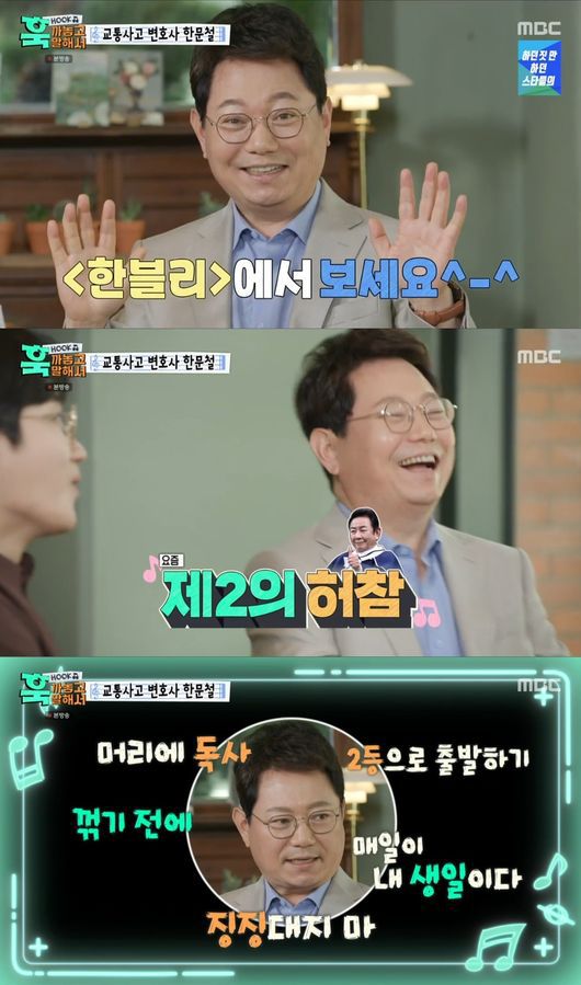 한문철은 짧은 이야기 만으로도 ‘1등 좋아하지마’, ‘꺾기 전에’라는 훅을 만들어냈다. 특히 노래를 좋아한다는 한문철은 가수 강진에게 원 포인트 레슨을 받고, 자이언티와 듀엣을 해 화제를 모으기도 했다. 특히 한문철은 YB의 ‘사랑은 교통사고’ 가사를 듣더니 “바람직하지 않다”고 지적해 웃음을 자아냈다. 한문철은 “요즘 보람을 많이 느낀다. 사고 예방을 위해서 평소 이야기하고 있던 걸 많은 분들이 해주고 계신다. 다른 분들보다 조금 더 잘할 수 있는 게 이거 하나다. 앞으로 숨쉬는 동안 이걸 해야겠다 싶다”며 “삶의 소중함도 느낀다. 아내와 나는 생일을 하지 않는다. 매일이 생일이기 때문이다”고 진심을 밝혔다.