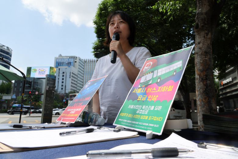 우리 모두의 교통 운동본부와 민주노총 공공운수노조 민주버스본부 서울지부 활동가들이 지난 5월19일 서울 중구 1, 2호선 시청역 1번 출구에서 ‘서울시 버스, 지하철 요금 인상 반대 서명운동’을 열고 지나가는 시민들의 동참을 호소하고 있다. 김혜윤 기자 unique@hani.co.kr |