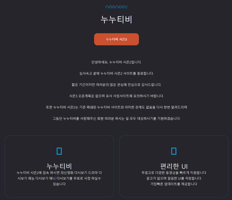 누누티비 시즌2는 홈페이지를 통해 “시즌3 오픈계획은 없으며 유사 사칭사이트에 유의하시기 바란다”며 “누누티비 시즌2는 기존 폐쇄된 누누티비 사이트와 어떠한 관계도 없음을 다시 한 번 알려드린다”고 적었다. 현재는 누누티비 시즌2를 통해 어떠한 콘텐츠도 이용할 수 없는 상황이다.