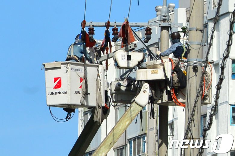 13일 오후 전국 대부분 지역에 폭염주의보가 발령되면서 전기 사용량이 상승하자 한국전력공사 포항지사 기술자들이 북구 장성동 일원에 있는 전신주에서 정전에 대비한 노후 개폐기 교체 공사를 하고 있다.2018.7.13/뉴스1 ⓒ News1 최창호 기자 |