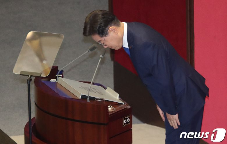 이재명 더불어민주당 대표가 19일 오전 서울 여의도 국회에서 열린 제407회국회(임시회) 4차 본회의에서 교섭단체 대표연설을 마치고 고개 숙여 인사하고 있다. ⓒ News1 임세영 기자