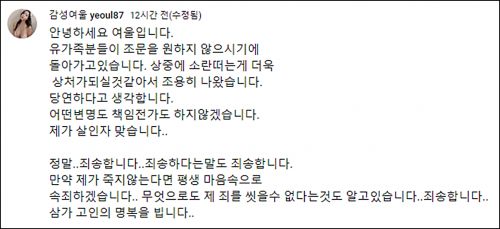 이어 "정말 죄송하다. 죄송하다는 말도 죄송하다. 만약 제가 죽지 않는다면 평생 마음속으로 속죄하겠다. 무엇으로도 제 죄를 씻을 수 없다는 것도 알고 있다. 죄송하다. 삼가 고인의 명복을 빈다"고 밝혔다.
