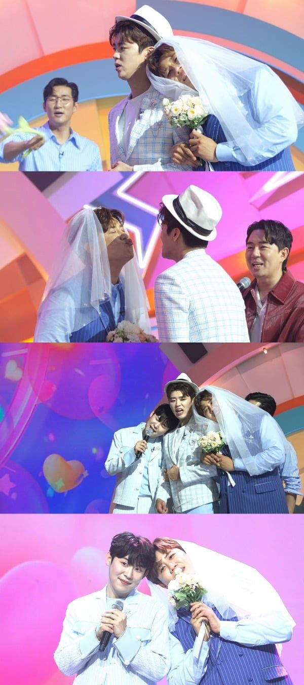 이때 진욱의 무대에 힘을 실어주기 위해 짝팀 박지현과 진해성이 나선다. 진해성이 갑자기 새하얀 면사포를 쓰고 등장하는 것. 진해성은 도도한 눈빛을 쏘며 박지현에게 찰싹 붙어 팔짱을 낀다.