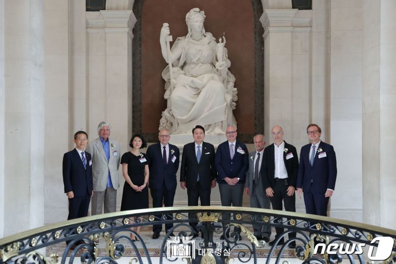 (서울=뉴스1) 안은나 기자 = 윤석열 대통령이 21일 오전(현지시간) 파리 디지털 비전 포럼을 위해 소르본 대학을 찾아 기념 촬영하고 있다. 왼쪽부터 이종호 과학기술정보통신부 장관, 비바테크 창립자 모리스 레비 퍼블리시스 그룹 감사회 의장, 플뢰르 펠르랭 코렐리아 캐피탈 사장, 라자 샤틸라 명예교수, 윤 대통령, 크리스토프 케레로 지역총장, 다니엘 앤들러 명예교수, 소설가 베르나르 베르베르, 마르쿠스 가브리엘 파리1대학 교수. (대통령실 홈페이지) 2023.6.21/뉴스1