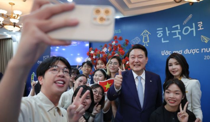 윤석열 대통령이 22일 하노이 국가대학교 별관에서 열린 베트남 한국어 학습자와 대화에서 참석자들과 기념사진을 찍고 있다. 연합뉴스 |