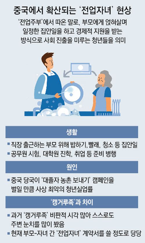 중국 상하이에서 대학을 졸업한 뒤 구직에 실패해 고향 산시성으로 돌아온 A 씨(25)는 부모와 함께 살며 최근 ‘전업자녀’(취안즈얼뉘·全職兒女) 계약서를 작성했다. A 씨의 아버지는 중학교 교사이고, 어머니는 옷가게를 하고 있다. 계약서에 따르면 A 씨는 평일 오전 6시에 일어나 출근하는 부모를 위해 아침을 짓고 청소, 빨래 같은 집안일을 하는 조건으로 한 달에 4000위안(약 72만 원)을 받기로 했다. 지난해 중국 도시근로자 월평균 임금이 5400위안(약 97만2000원)인 점을 감안하면 적지 않은 금액이다. A 씨는 지무(極目)신문에 “아르바이트 사장이 부모님이 된 것일 뿐”이라며 “고향에서 구직 활동을 이어 나갈 생각”이라고 밝혔다.
