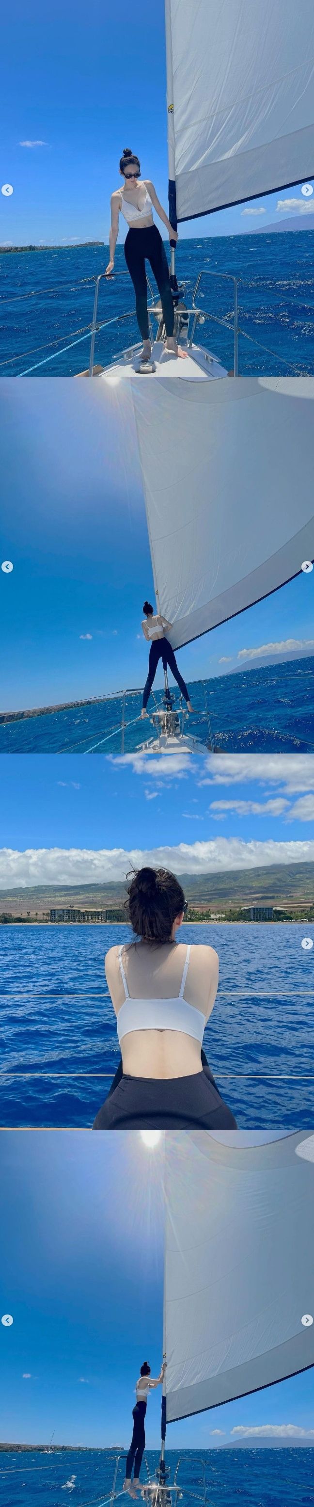 사진에서 강민경은 요트를 타고 있는 모습으로, 레깅스를 입은 채 콜라병 몸매를 뽐내고 있는 모습이다. 특히 그는 반전 볼륨감과 개미허리가 돋보이는 '황금 골반'까지 자랑하며 우월한 몸매를 인증했다.