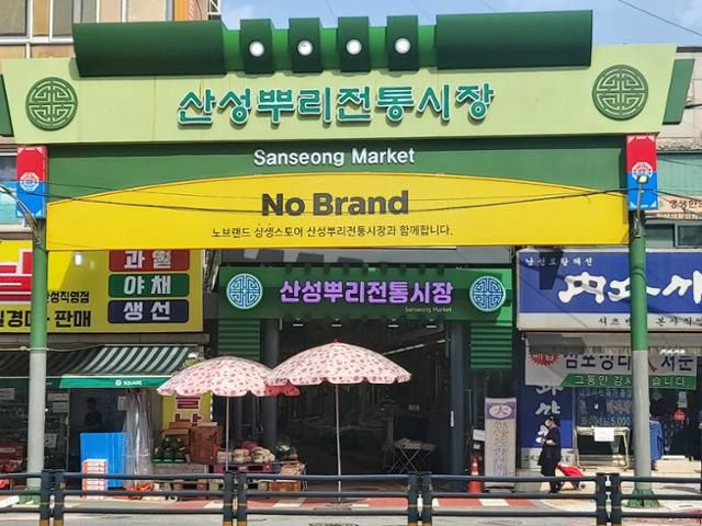 16일 오후 찾아간 산성뿌리전통시장은 얼핏 보면 전형적인 소규모 동네 전통시장과 다르지 않았다. 하지만 시장 입구엔 '잘못 봤나'라는 생각이 들게 하는 '엉뚱한 간판'이 걸려 있다. 바로 시장 간판 바로 아래에 자리 잡은 노란색 '노브랜드' 간판이다. 궁금한 마음을 안고 시장을 둘러보니 이내 노브랜드 상생스토어가 눈에 들어왔다. 위치도 목 좋은 시장 한복판이었다.