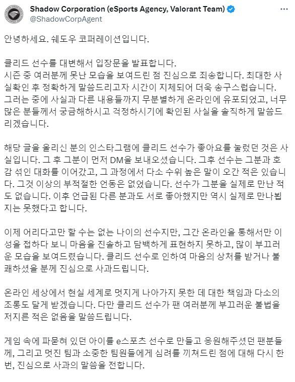 아울러 “온라인 세상에서 현실 세계로 멋지게 나아가지 못한 데 대한 책임과 다소의 조롱도 달게 받겠으나, 클리드 선수가 팬 여러분께 부끄러운 불법을 저지른 적은 없다”고 강조했다.