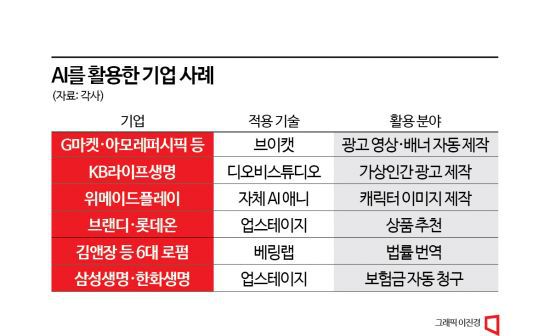 AI가 가장 빠르게 침투한 영역은 마케팅이다. AI가 상품 홍보 문구나 영상을 대신 만들어 비용 절감 효과가 크기 때문이다. 영상 생성 AI 브이캣을 적용한 G마켓이 대표적이다. 브이캣은 제품 URL을 넣으면 1분 만에 홍보 영상과 배너 수십개를 만들어 준다. G마켓은 브이캣 도입 후 내부 디자이너 2명으로 하루에 배너 광고 600개를 제작한다. 이전에는 외주업체를 동원해야 하던 일이다. 오는 9월에는 배너 제작 수를 1500개로 늘릴 예정이다. 효율성이 높아 아모레퍼시픽, LG전자, 롯데온 등이 브이캣을 이용 중이다. 삼성전자, 현대차와도 논의 중이다. 정범진 브이캣 공동대표는 "다양한 브랜드와 제품을 가진 대기업은 마케팅에만 수백명의 인력을 투입한다"며 "이를 효율화하기 위해 AI 기술을 내재화하고 싶어한다"고 말했다.