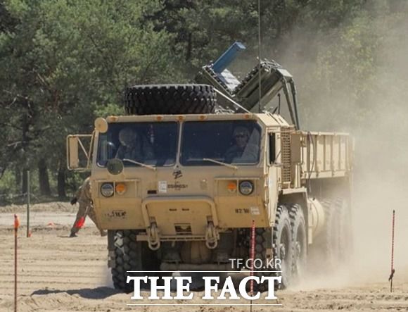 대민이 도입할 M136 볼케이노 대전차 지뢰 살포 체계를 탑재한 M977 'HEMTT' 트럭이 주행하고 있다. /타이완뉴스 |