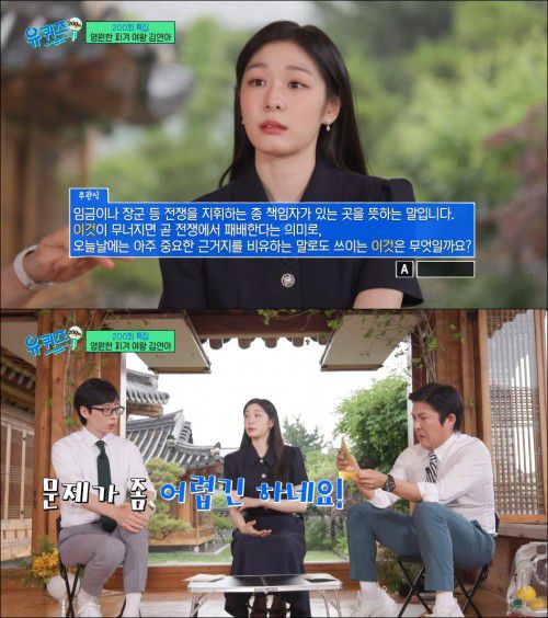 토크 마지막에 유퀴즈 타임에 김연아는 정답을 맞히지 못했다. 최근 유퀴즈에 출연한 스타들은 대부분 그와 관련된 수식어나, 키워드 위주로 금방 정답을 연상할 수 있는 수준의 질문을 받는 편이었다. 하지만 이날따라 김연아가 받은 문제의 난이도는 한 번에 떠올리기에 어려운 수준이었다.