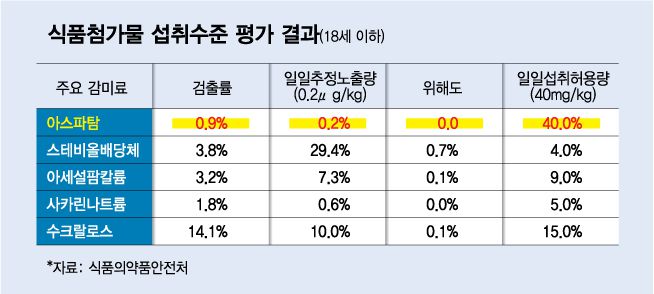 3일 식품의약품안전처에 따르면 지난해 5월 식품의약품안전평가원은 18세 이하의 선호식품 1219개 제품을 대상으로 식품첨가물 섭취 수준을 평가한 결과 감미료로 쓰이는 아스파탐의 위해도는 0.0%로 조사됐다.