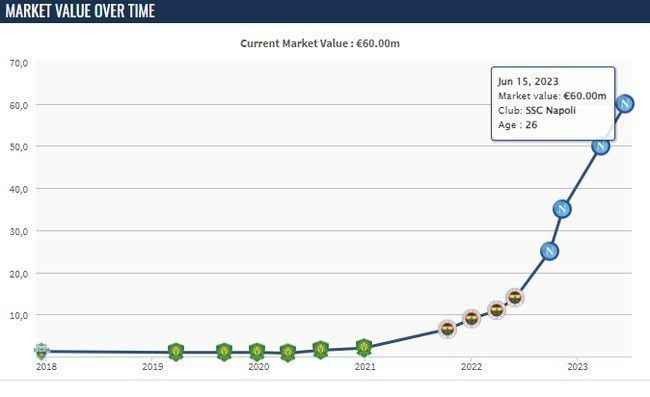 실제로 김민재는 축구 통계 매체 '트랜스퍼마크트'가 업데이트한 몸값에서 6,000만 유로(약 852억 원)로 평가됐다. 2021년 10월 페네르바체 입단 당시 몸값 불과 650만 유로(약 92억 원)다. 2년이 채 되지도 않아 무려 823%가 상승한 셈이다.