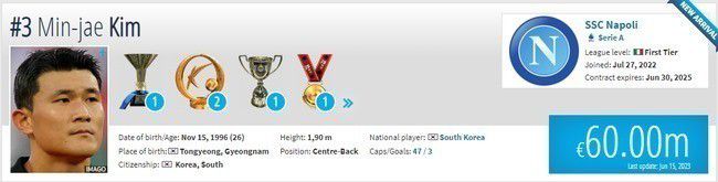 '트랜스퍼마크트' 기준 김민재는 손흥민을 제치고 '대한민국 최고 몸값 선수'로 등극했다. 나폴리 선수 가운데 3등, 1996년생 선수 가운데 4등, 이탈리아 세리에A 선수 가운데 7등, 전 세계 센터백 가운데 8등, 전 세계 축구 선수 가운데 58등이다.