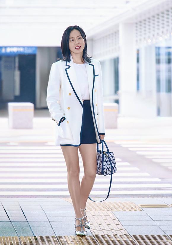 이날 손예진은 네이비 컬러 라이닝이 들어간 화이트 컬러의 재킷과 네이비 컬러 쇼츠로 세련된 공항 패션을 완성했다. 클래식한 컬러의 조화는 손예진 만의 변치 않는 우아함을 한층 돋보이게 한다. 여기에 실버 컬러의 펌프스로 세련된 포인트를 줬다.