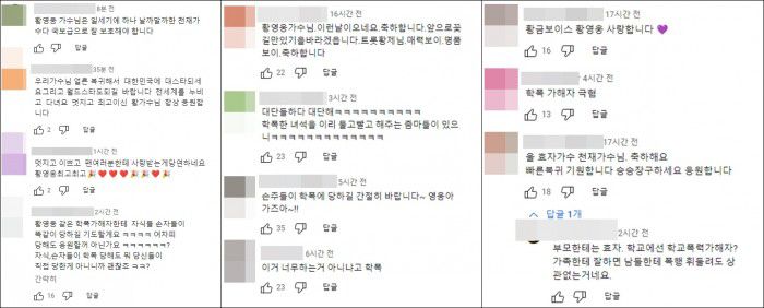 반면 응원 댓글 사이에는 "황영웅 학폭 가해자인데 자식들, 손자들이 똑같이 당하길 바란다. 어차피 당해도 응원할 것 아니냐?", "학폭한 사람을 이렇게 응원하다니", "손자들이 학폭에 당하기를 바랍니다", "학폭인데 이거 너무한 거 아닌가요", "학폭 가해자 끔찍하게 싫다" 등의 반응도 눈에 띈다.