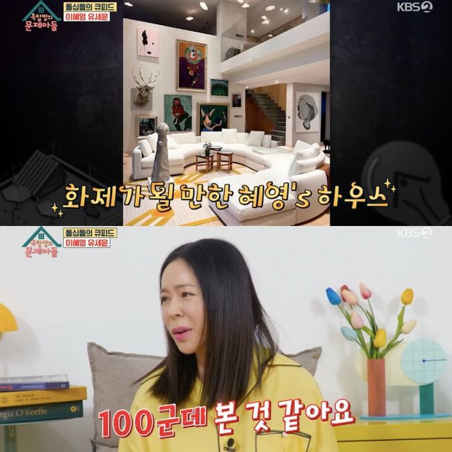 이날 김숙은 화제의 이혜영 집을 언급했다. 이혜영의 집은 한강뷰 럭셔리 자택으로 갤러리 같은 인테리어로 인해 SNS에서 화제가 될 정도라고. 이혜영은 “결혼하고 1년 반 동안 구하러 다닌 집이다. 100군데 본 것 같다”라고 밝혀 놀라움을 자아냈다.