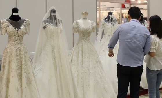━웨딩 박람회에서 드레스를 보고 있는 예비 부부. 〈사진=연합뉴스〉 |