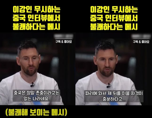 이에 메시는 "중국은 정말 존중이라고는 없는 나라다. 이강인은 라리가에서 본인 실력을 이미 증명했고 엄청난 포텐셜을 잠재하고 있는 쉽게 설명하면 그냥 타고난 천재라고 생각한다"며 "그가 파리에 와서 내 뒤를 이을 자격은 충분하다고 생각한다. 중국의 우레이? 그 선수는 이름도 들어본 적이 없다"라고 적힌 자막이 담겨 있다.