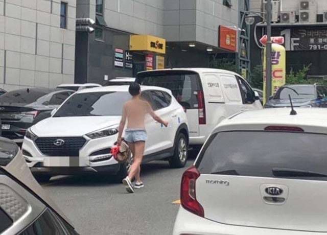 온라인상에서 대구에서 한 여성이 대낮에 상의를 탈의한 채 거리를 활보하는 모습이 화제가 됐다. /온라인 커뮤니티 캡처 |
