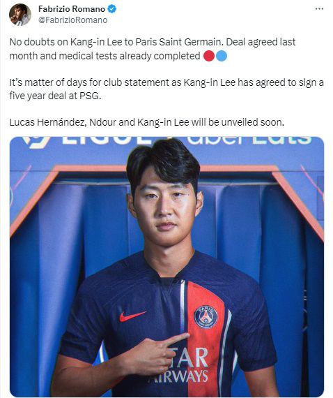 로마노 기자도 "이강인이 PSG로 가는 건 의심의 여지가 없다"라며 "지난달에 합의된 계약과 메디컬 테스트는 이미 완료됐다"라고 전했다.