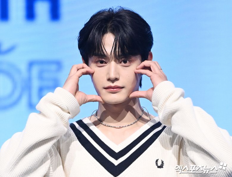 이날 쇼케이에 참석한 제로베이스원 김지웅이 포토타임을 갖고 있다.