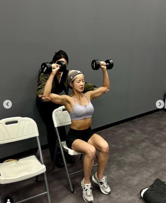 함께 공개한 사진 속에는 촬영 중으로 보이는 이시영의 모습이 담겼다. 브라톱에 짧은 레깅스 팬츠를 매치한 이시영은 덤벨을 들고 다양한 운동 동작을 취하고 있다.