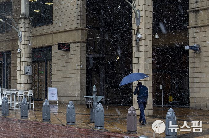[신화사 요하네스버그=뉴스핌 특약] 홍우리 기자 = 10일(현지시간) 한 행인이 우산을 쓴 채로 눈 내리는 요하네스버그 도심 거리를 지나가고 있다. 남아프리카공화국 중부 하우텡주의 요하네스버그에는 이날 오전 한때 눈이 내렸다. 이곳에 눈이 관측된 것은 이례적으로, 2012년 이후 처음이다. 2023.07.11 hongwoori84@newspim.com