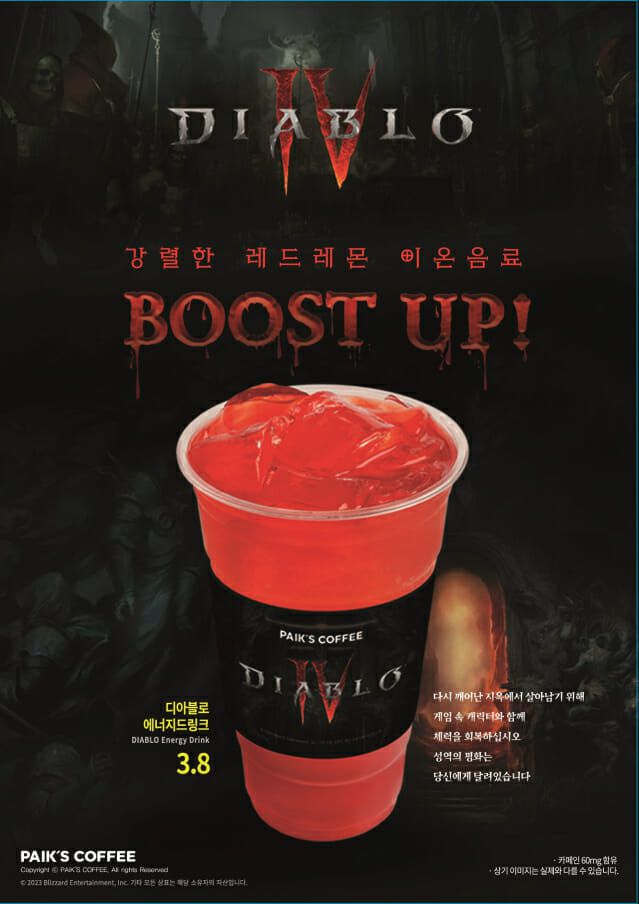 디아블로4가 더본코리아의 커피전문점 브랜드 ‘빽다방’과 손잡고 선보인 ‘디아블로 에너지 드링크’ 이미지. 사진 | 블리자드