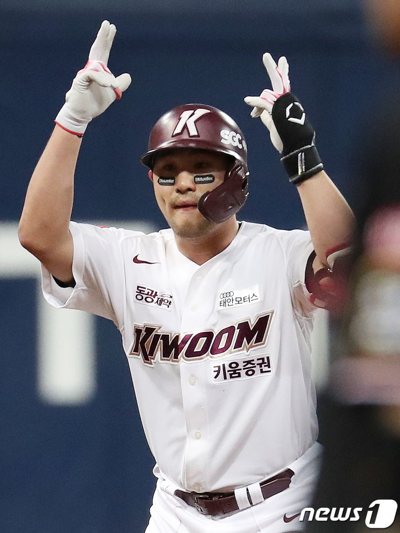 (서울=뉴스1) 민경석 기자 = 11일 오후 서울 구로구 고척스카이돔에서 열린 '2023 신한은행 SOL KBO리그' kt wiz와 키움 히어로즈의 경기 4회말 1사 주자 1,2루 상황에서 키움 임지열이 1타점 적시타를 친 뒤 기뻐하고 있다. 2023.7.11/뉴스1